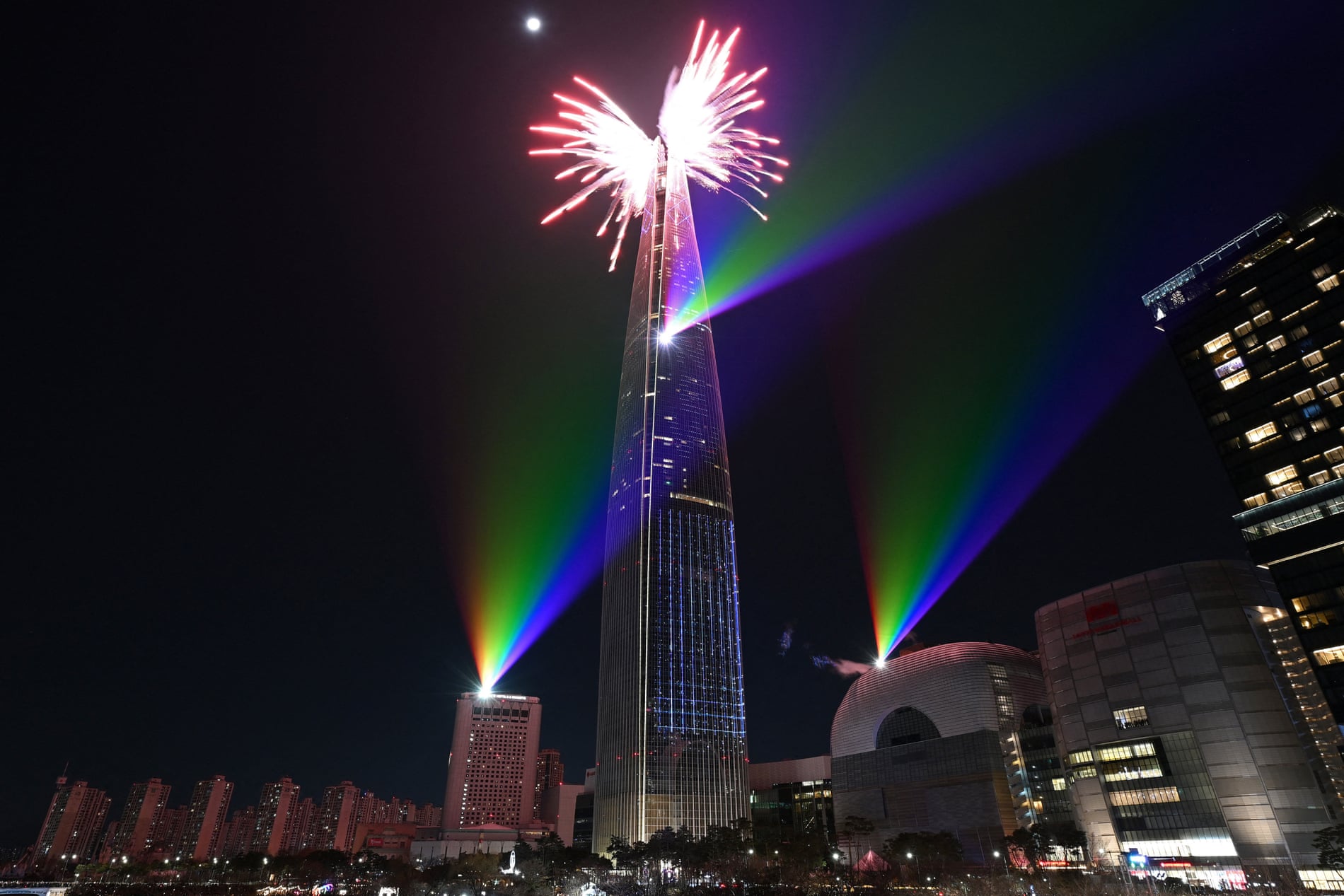 Seoul, Hàn Quốc: Pháo hoa thắp sáng bầu trời đêm phía trên tòa tháp Lotte World Tower, tòa nhà cao nhất Hàn Quốc.