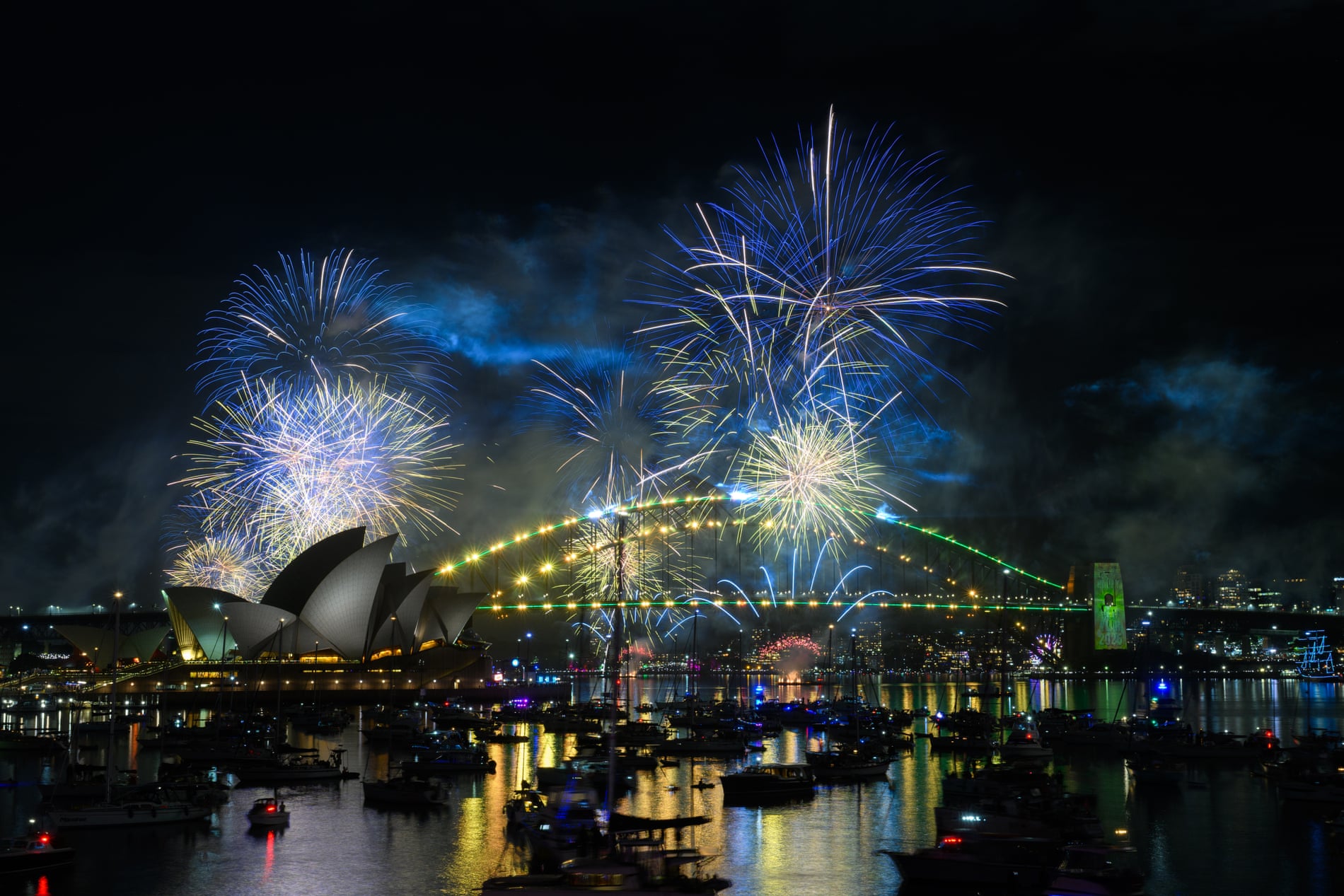 Sydney, Australia: Pháo hoa được bắn lên trên bầu trời cầu cảng trong màn trình diễn đêm giao thừa tại Mrs Macquaries Point.