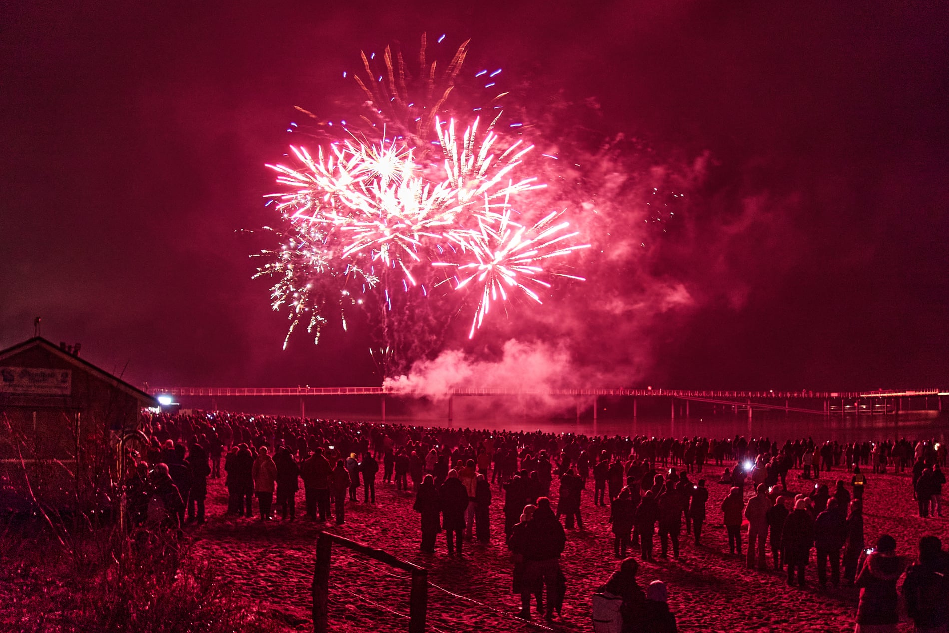 Người dân xem pháo hoa trên bãi biển Baltic ở Timmendorfer Strand, Đức, sáng sớm thứ Năm, ngày 1 tháng 1 năm 2026.