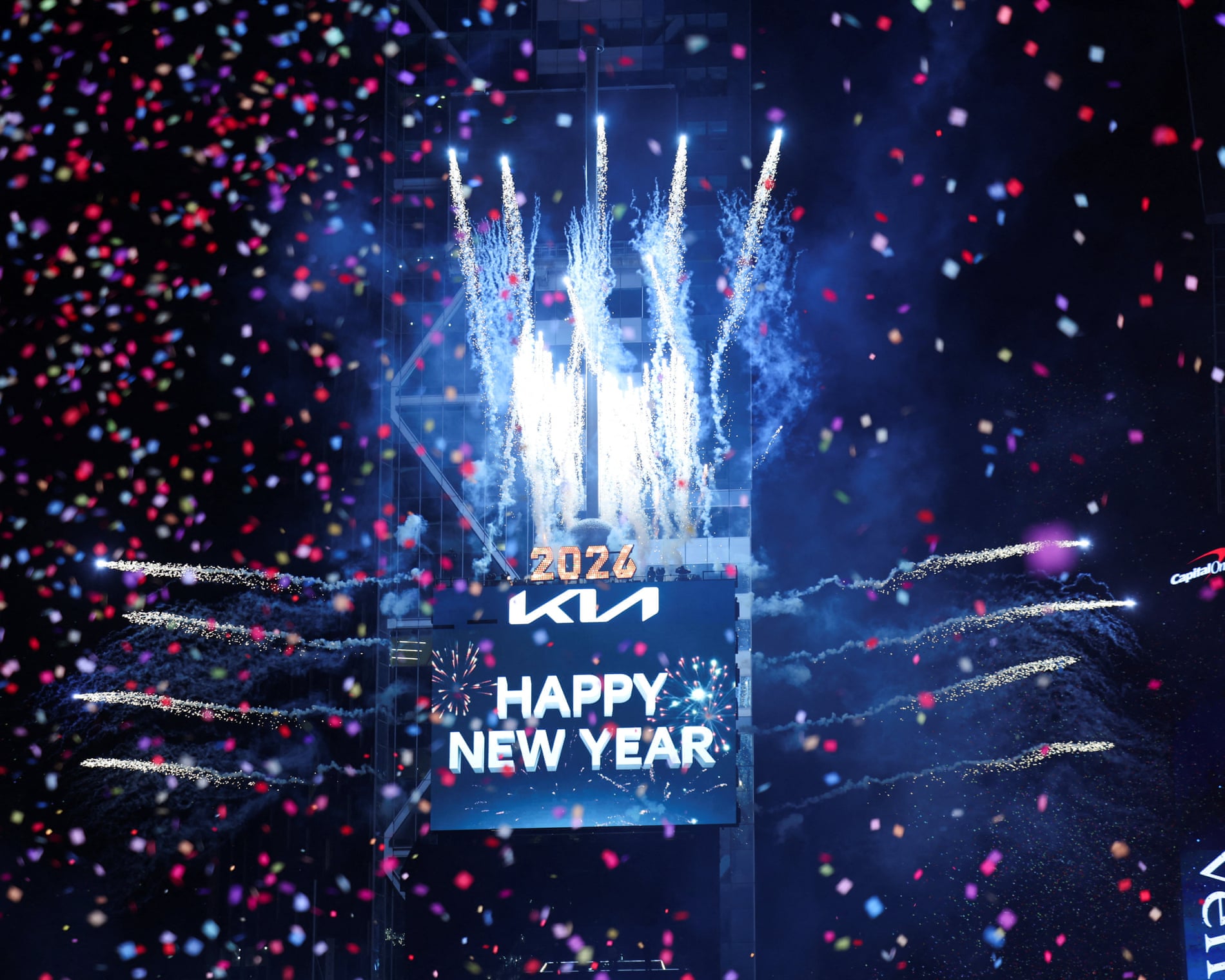 Pháo hoa nổ rực rỡ và pháo giấy rơi xuống sau khi nút pha lê được nhấn, báo hiệu quả cầu đón năm mới hạ xuống tại Quảng trường Thời đại.